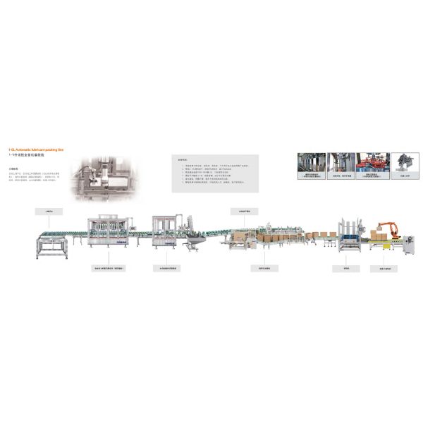 It is Lubricant Filling Packaging Line is special designed for lubricant filling, including inlet bottle, filling, capping, induction sealing, labeling, carton open, packing, carton sealing and robot stacking.